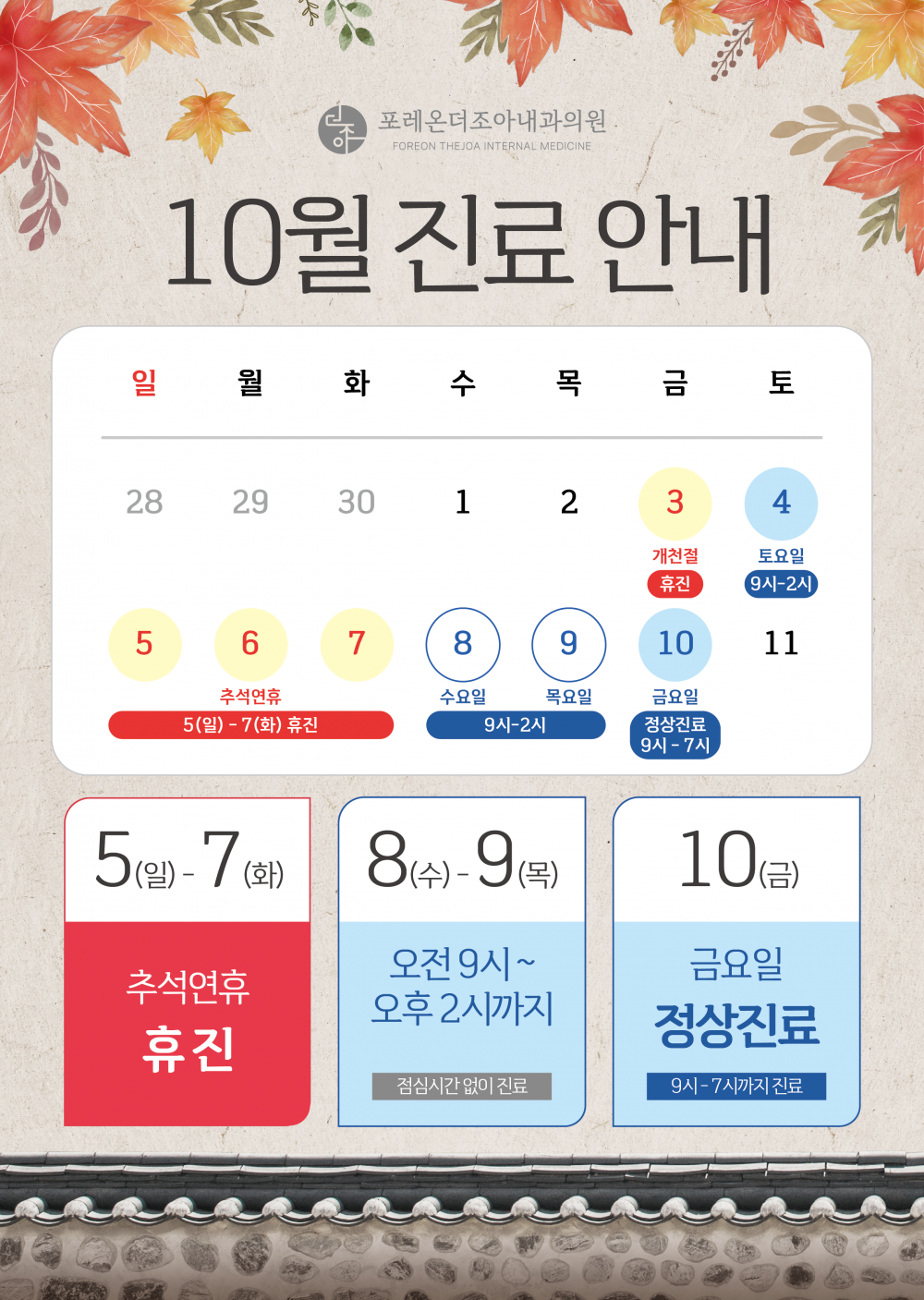 10월 진료일정을 안내해 드리니 예약 및 내원에 참고 부탁드립니다.